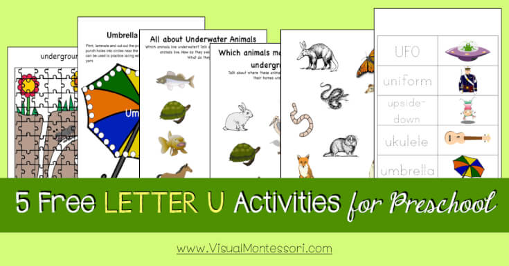 Well, you are in the right place. In this post I am sharing 5 FREE Preschool Worksheets for Preschool Alphabet Letter U. It’s a sample pack from our family’s preschool at home program, Visual Montessori, based upon the 12 sensitive periods as outlined in Montessori.