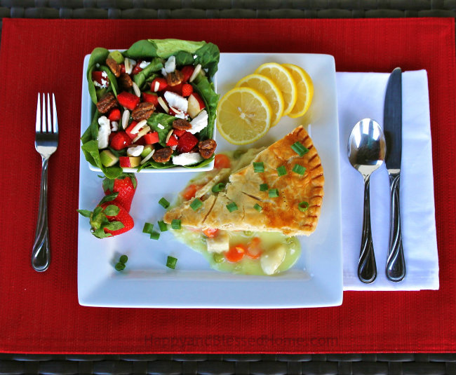 Now, as an adult, I like to pair my Family Sized Chicken Pot Pie meal with my favorite Apple and Pecan, Fruit and Nut Salad. It’s a crisp, hearty salad that combines fresh fruits like strawberries, pears, and apples, with the crunchy sweet taste of sliced almonds and candied pecans. I like to add some feta cheese on top for a creamy texture. This salad has so much flavor that I don’t think it needs a salad dressing – and I often eat it just the way I’ve pictured it here.