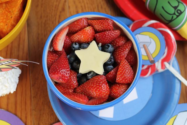 I used cookie cutters to make shapes in thick slices of cheese for all the characters. For Iron Man, I simply washed some strawberries and placed a thick slice of monterey jack cheese cut in the shape of a circle in the center – representing Iron Man’s power source.