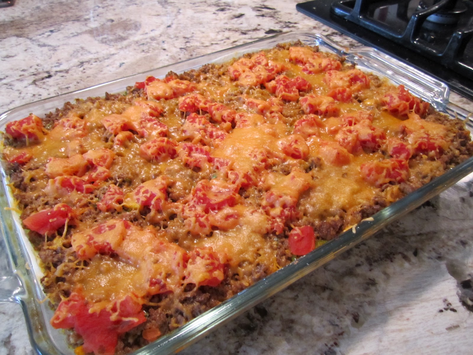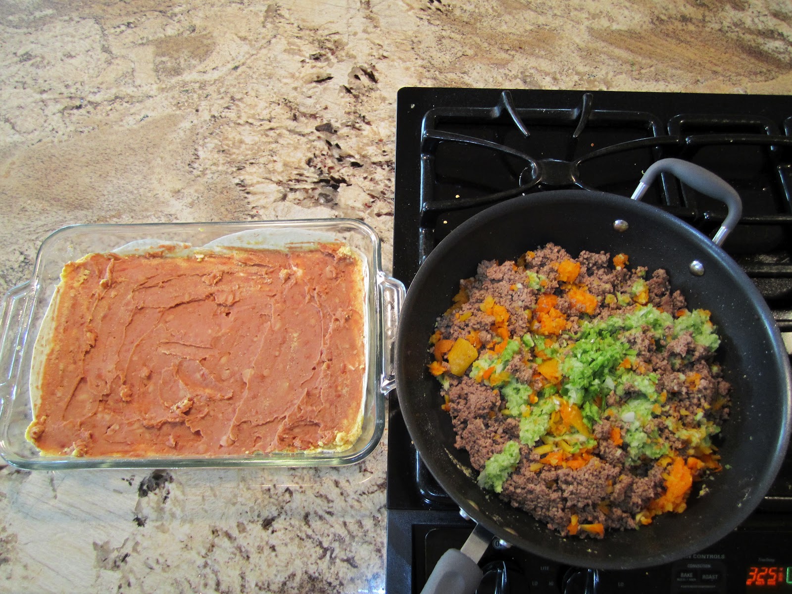 | Lasagna dish is layered with flour tortilla, corn meal and refried beans. Pan has 3 lbs. of ground beef with bell peppers and onions from the food processor. |