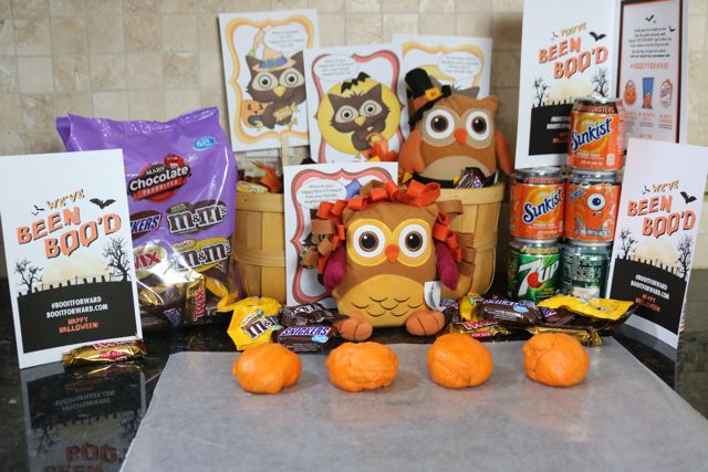 I layered the 3 of the 7UP® 8oz mini Halloween cans and 3 of the Sunkist® 8oz mini Halloween cans on the bottoms of each of my baskets. I then added caramel apples (follow package directions for caramel apples), Chocolate Mix Fun Size MARS® candies, stuffed owls, and a “Boo It Forward” card. [The Boo It Forward card may expire – if it does, please use my fun FREE cards below.]