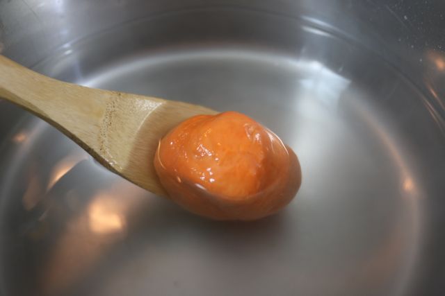 - Drench the Pumpkins – In a large pot, add four cups of hot tap water. Dissolve the baking soda in the hot tap water – do not boil. Once mostly dissolved, dunk the mini pumpkins briefly into the baking soda/water mix, one at a time — coating the outside of pretzel dough. You do not want to soak the pretzel dough, you only want to coat the exterior with the baking soda and water mix. Pat any excess wetness with a paper towel.