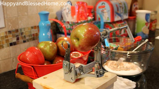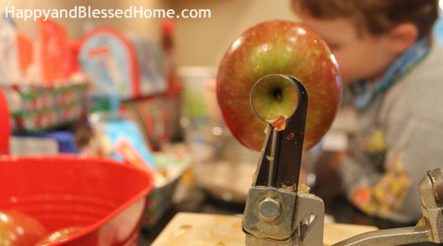 You may notice my little helper in the background. He had so much fun peeling and coring apples. If you decide to include children in this baking endeavor just keep them under close adult supervision – the tools have sharp edges. My son loved being able to tell me how strong he was as he peeled and cored apples!
