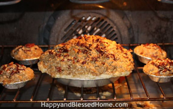 8. Step 8 – Bake the Caramel Pecan Apple Pie. Place your apple pies on the top rack of your oven at 375 degrees for 55 minutes. Cook with foil on for the first 30 or so minutes and foil off for the last 25. I highly recommend a baking sheet on the bottom rack to catch the overflow of baking juices that will ooze out of your pie. Try to use something with a rim if you have it. It makes cleanup much easier.