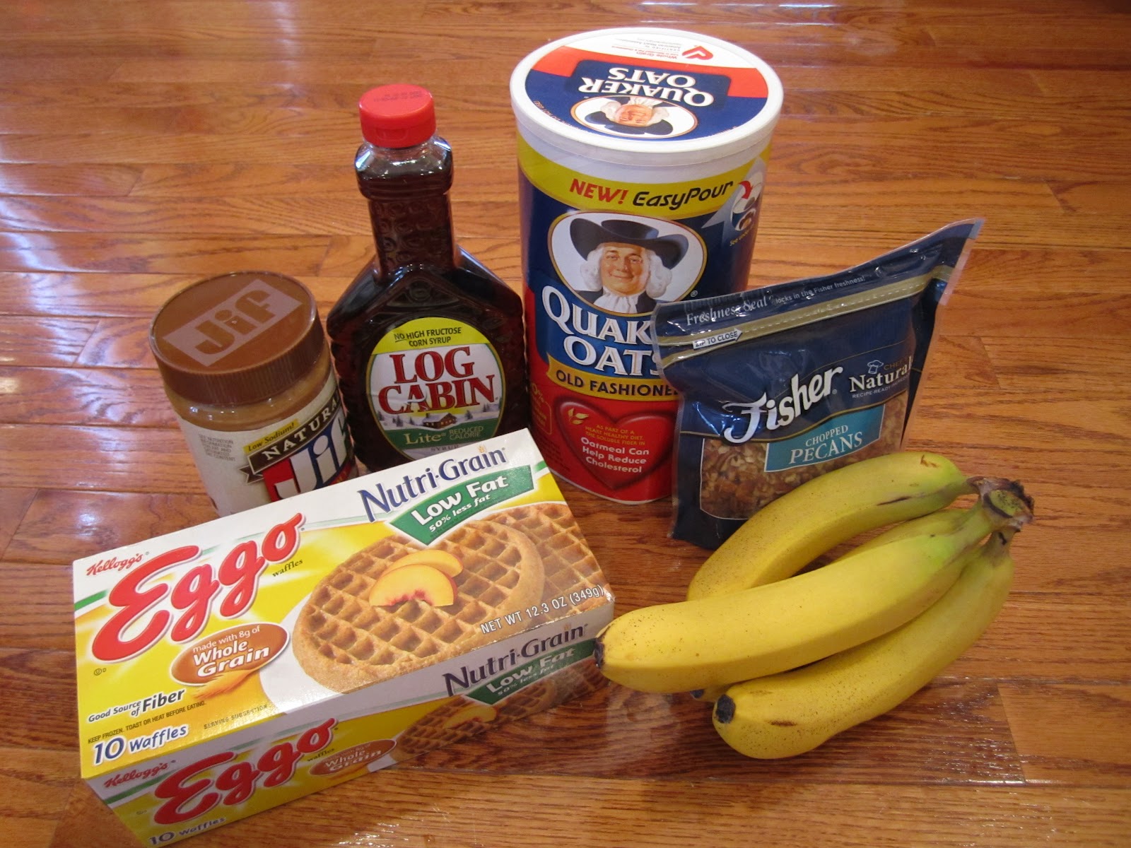 | Breakfast is either waffles with 1 tsp. PB and syrup or oatmeal with bananas and pecans. |
