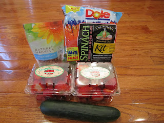 | Lunch is my favorite spinach salad (no blue cheese) with glazed pecans, cucumber and strawberries. |