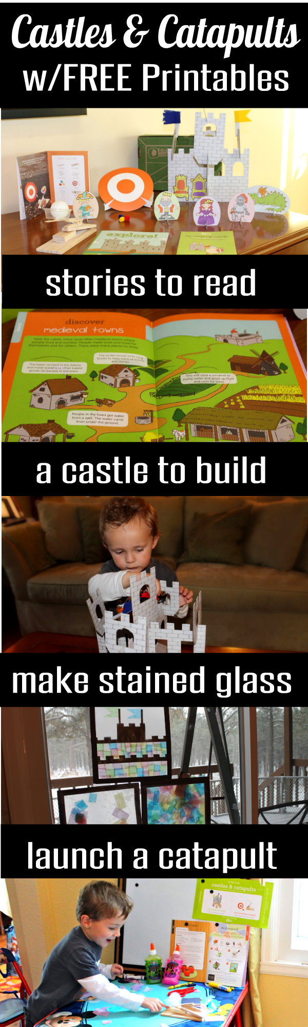 Even after my two year-old went down for an afternoon nap, my four year-old continued to enjoy playing with the castles and catapults play set. He spent the entire afternoon making up stories, adding stickers to the castle, cutting and decorating shields, and playing with the catapult. Outdoor temperatures dropped into the teens so it was wonderful to be indoors and enjoying a day of castles and catapults with the boys.