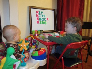We also spent some time rolling out play-dough to create words starting with the letter “K”. I used cookie-cutters made by Wilton. A huge set of all sorts of cookie cutters is only $10 at Walmart. Now we can create all sorts of things with play-dough. Great photos of our fun are included below.