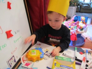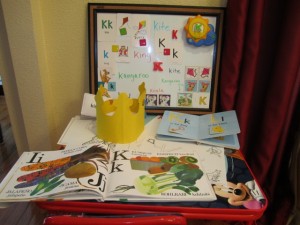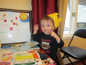 I didn’t have much for a sensory bin but we have some lovely alphabet inspired books with the letter “k” featured. The magnet board included flash cards with the words kite, king, kangaroo, key, koala, and kiss. Peanut enjoyed wearing the crown and we spent time reviewing the words, coloring and playing with his new “hat”. The magnets didn’t last long on the board – Peanut loves to play with magnets. If you’re doing this at home, no need to buy anything new, just look around for books or toys you already have.