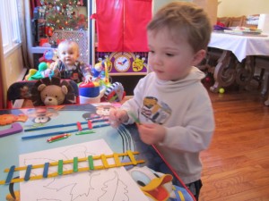 We’re journeying through the alphabet and today our preschool alphabet games included building a ladder as a part of our study of the letter “L.” Peanut is 32 months and we are linking up with http://www.1plus1plus1equals1.net/tag/tot%20school/.