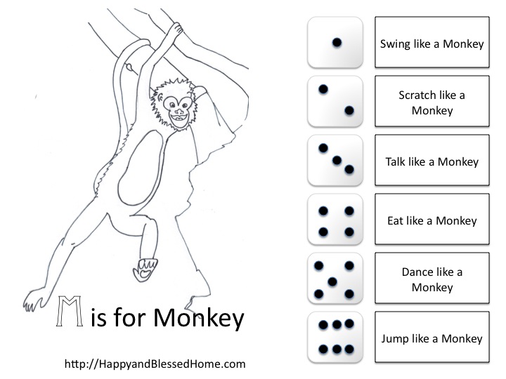 Now, I don’t actually own the game Tumblin Monkeys, but I was inspired by Debi’s post to create a Monkey Game for my two-year old. It’s a super-easy dice game. You roll the dice and then have your child (or children) act out the Monkey actions. How FUN! Here is what the Monkey Dice Game looks like. I drew the monkey by hand and then uploaded it as a JPEG to Power Point to create the other graphics. This game will make a wonderful addition to our Preschool Alphabet Games and our next letter is the letter “M”. You can download a free PDF here: Monkey Game.