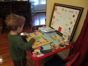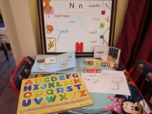 I used flash cards from our “Hooked On Phonics” set and they included a necklace, nest, needle, nose, nail and net. I also love our alphabet letter book where you trace the shape of each letter with your fingertip. I used alphabet blocks to spell out “necklace” and “newt” since those became our star activities for the day.