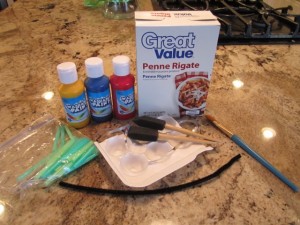 All the items you see below are things I already have in our home. As you can see I did not have much in terms of “sensory” items which is why our craft today was so fun. We made a “noodle necklace” more on that later. Peanut is 32 months old and we are linking up at 1+1+1=1 and Weird Unsocialized Homeschooler’s.
