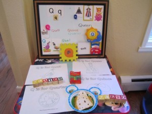 We’re enjoying our preschool alphabet games and this week we are studying the letter “Q”. Peanut is 34 months old. “Q” is a challenging letter in some ways because there aren’t as many words that start with the letter “Q”. For a sensory item I used a Quesadilla. Peanut enjoyed the melted cheese and soft texture of the flour tortilla. Other items on his magnet board included flashcards of a queen, quilt, and quail. I also drew some coloring sheets that included pictures of a queen, quarter, quail and quince (a fruit that looks a bit like a pear). You can download these free printables for Letter Q.
