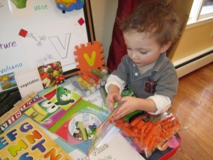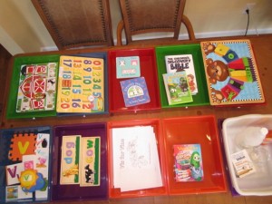 The purpose of this tool is to help brainstorm new ideas on ways we can implement learning and I’m not using it like a checklist but more like a brainstorming tool. Some of the things we do during the week are also great for learning but were never planned. I think that having tools like this mainly helps me to be more intentional about the time I spend with my little ones. There are 12 categories and each week I load up drawers full of activities that help us to do at least one activity in each category. For this week (Letter “V”) here is what the drawers looked like: