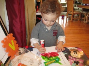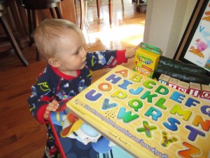 I’ve been asked by a few moms how long it takes to do these activities. I’d say it’s anywhere from five to fifteen minutes per activity and I only do two or three a day. The rest is free play. Sometimes Peanut will take a real interest in something and spend more time at it, if he does, I let him lead. I’m just trying to introduce him to concepts and make it FUN. 😉