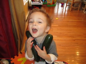 Our theme for the week is Vegetables. Both my boys were fascinated with the cucumbers I placed on the play table. I had carrots on the table too, but the cucumbers were the biggest hit.