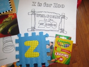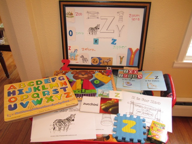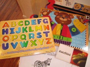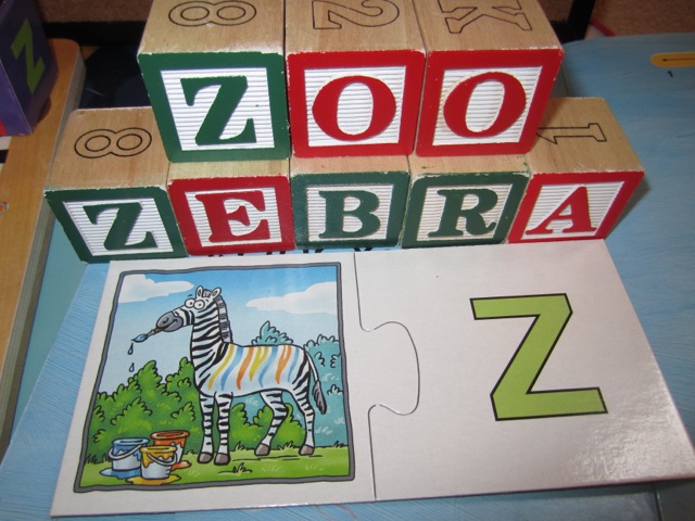 Here is the table set up for this week. It includes the boards I’ve mentioned as well as styrofoam letters of “Z” as well as an alphabet book and a book about words that start with “Z”.