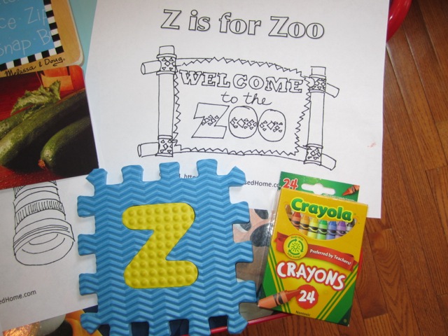 Our set-up for our letter “Z” study included flashcards of a zebra, zipper, zoo and the number zero; and I drew a zoom lens in addition to a zebra, zipper, and zoo sign. We use “Hooked On phonics” flash cards and these “Go Fish” flashcards by School Educational Products for our preschool alphabet study.