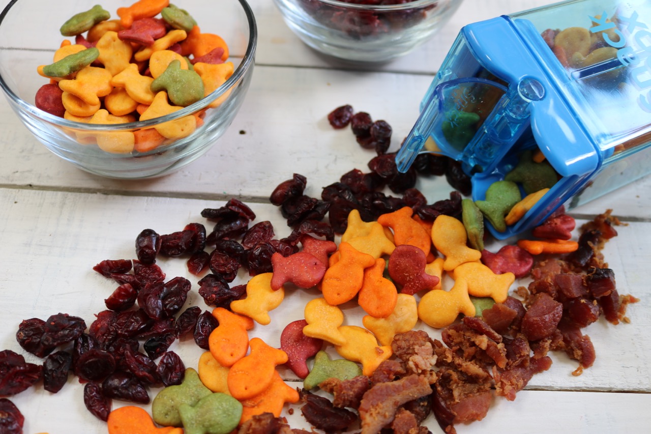 My son loves dried cranberries and Goldfish® crackers. And I want him to eat more protein. So what does a mama do? She cooks up some bacon — and crumbles it — into…the…mix. And she creates — a Bacon, Cranberry, and Goldfish® crackers Snack Mix Recipe.
