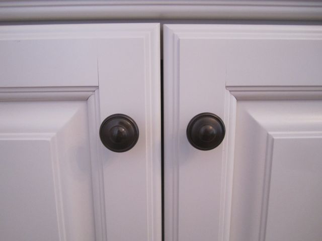 I selected two cabinet tones for the kitchen. For the L-shaped counter I opted for cabinets painted in a creamy white and for the island I selected a warm cherry. I love the way the island looks like a piece of furniture in the room. These are the oil-rubbed bronze knobs and you can see some of the detail on the raised panel doors. Our cabinets are full-overlay.