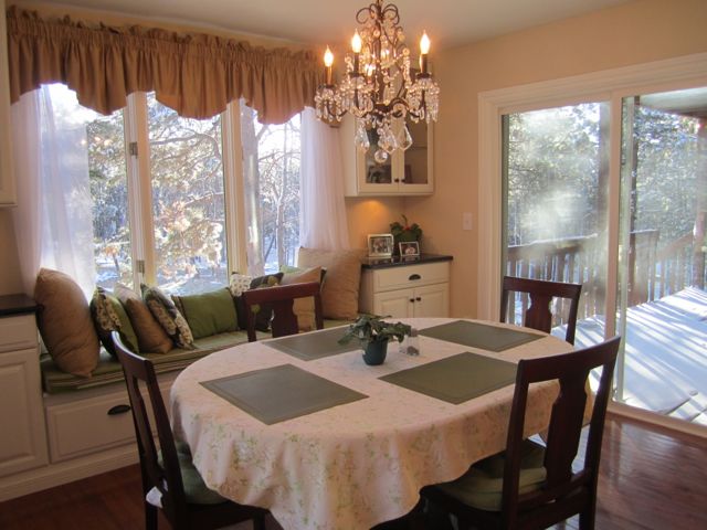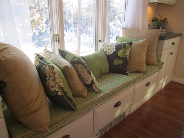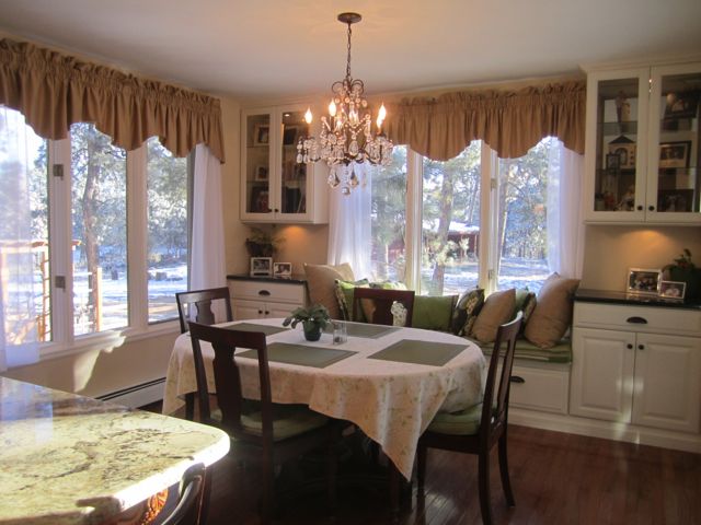 This is our new breakfast area. To truly appreciate the change, please scroll to the the photos towards the end to see the “before” pictures. This breakfast area is surrounded by natural light. Everything is new. The oil-rubbed bronze chandelier adds glamour to a once plain space. The window seat has three highly-functional drawers for storage at the base and the cushions and pillows were handmade.