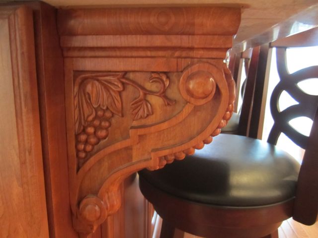 This corbel is made of cherry wood. I opted to purchase this online from Osbourne Wood Products at a fraction of the cost of the cabinet manufacturer. Shermin-Williams matched the stain. I recommend this to anyone trying to save money on their remodel. We couldn’t be happier with it’s appearance and functionality.