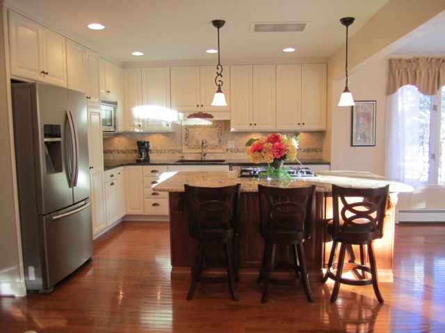 This is our new kitchen. We went from white tile floors, dark oak cabinetry, low-hanging soffits, and baby-blue countertops to a completely updated kitchen complete with hardwood floors, granite countertops, solid cherry and maple cabinetry, stainless steel appliances, new lighting, and custom touches from the corbels to the window seat.