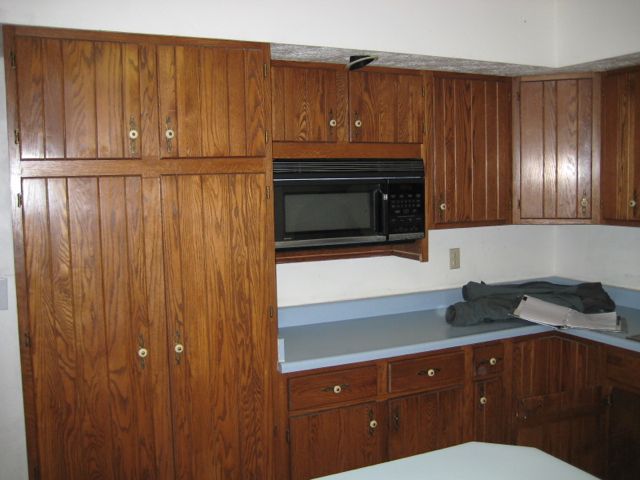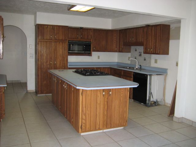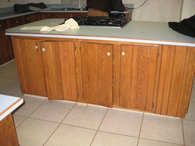 When we first purchased the house the floor was white tile. The cabinets were a dark oak and the countertops were baby blue. There were burn marks on the counters. The fridge was missing and the dishwasher did not work; it actually threw sediment on the dishes making them harder to clean by hand. There was a box light on the ceiling which gave off very poor light. The soffits were useless; they housed two broken can lights.