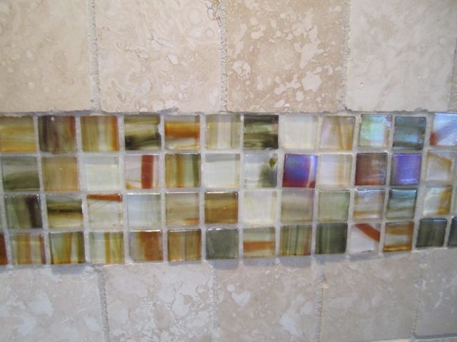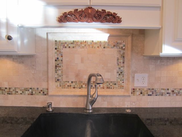 This is the backsplash behind our granite kitchen sink. The field is of travertine from Lowes and the accent tile is Hirsch Glass that can be purchased from CAPCO tile. The center of the frame is laid out in a tile pattern known as “venetian”. The faucet is superb. It is from Delta and is in a brushed nickel finish.
