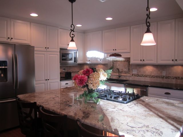 In the old kitchen the cabinets were hung beneath a soffit that served only to house two broken can lights. Our contractor removed the soffits and we were able to install 39″ cabinets and a 3″ crown moulding. The cabinets are by Diamond and include pull-out shelves and soft-close hinges. The can-lighting in the ceiling, the pendants, and the task lighting are updates as well.