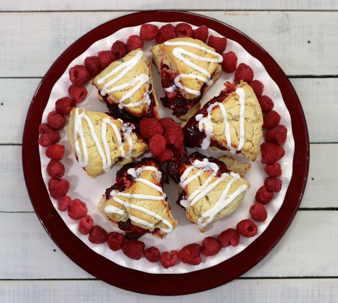Step 9 -Decorate the scones. Once the scones cool for 5 minutes, squeeze on some cookie icing. These Raspberry Scones are best served warm.