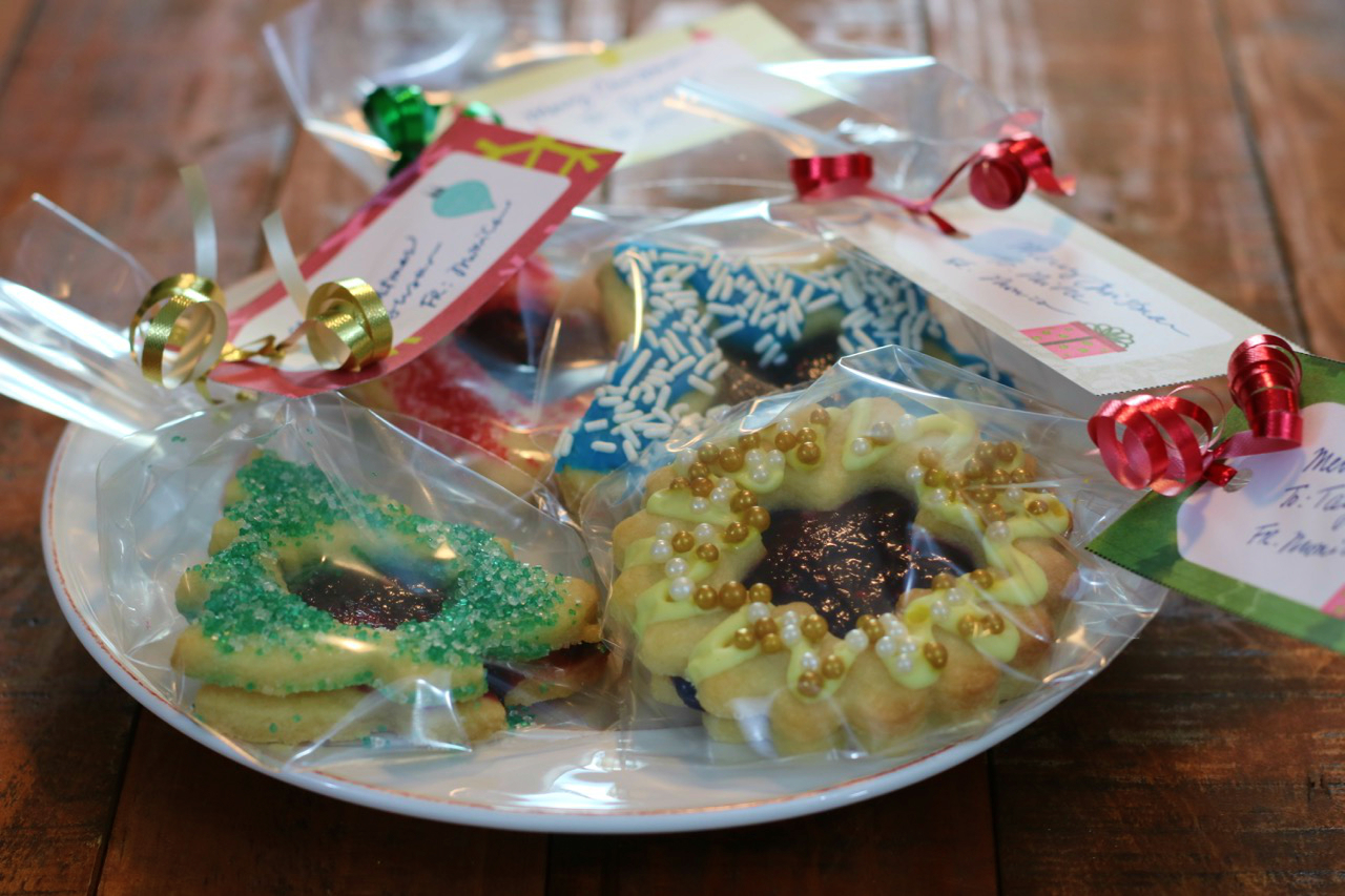 You can either tie a bow or use the sharp edge of some scissors to curl the ribbon. When curling ribbon you want to pull against one side of the ribbon gently but quickly against the sharp edge of the scissors. Do not try to out tension on all of the ribbon and be careful not to pull too hard because you’ll strip the ribbon. You may want to practice a few times before trying it on your cookie gift. Be careful with the scissors not to cut yourself while curling the ribbon.