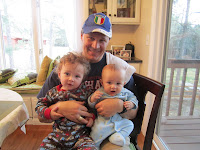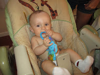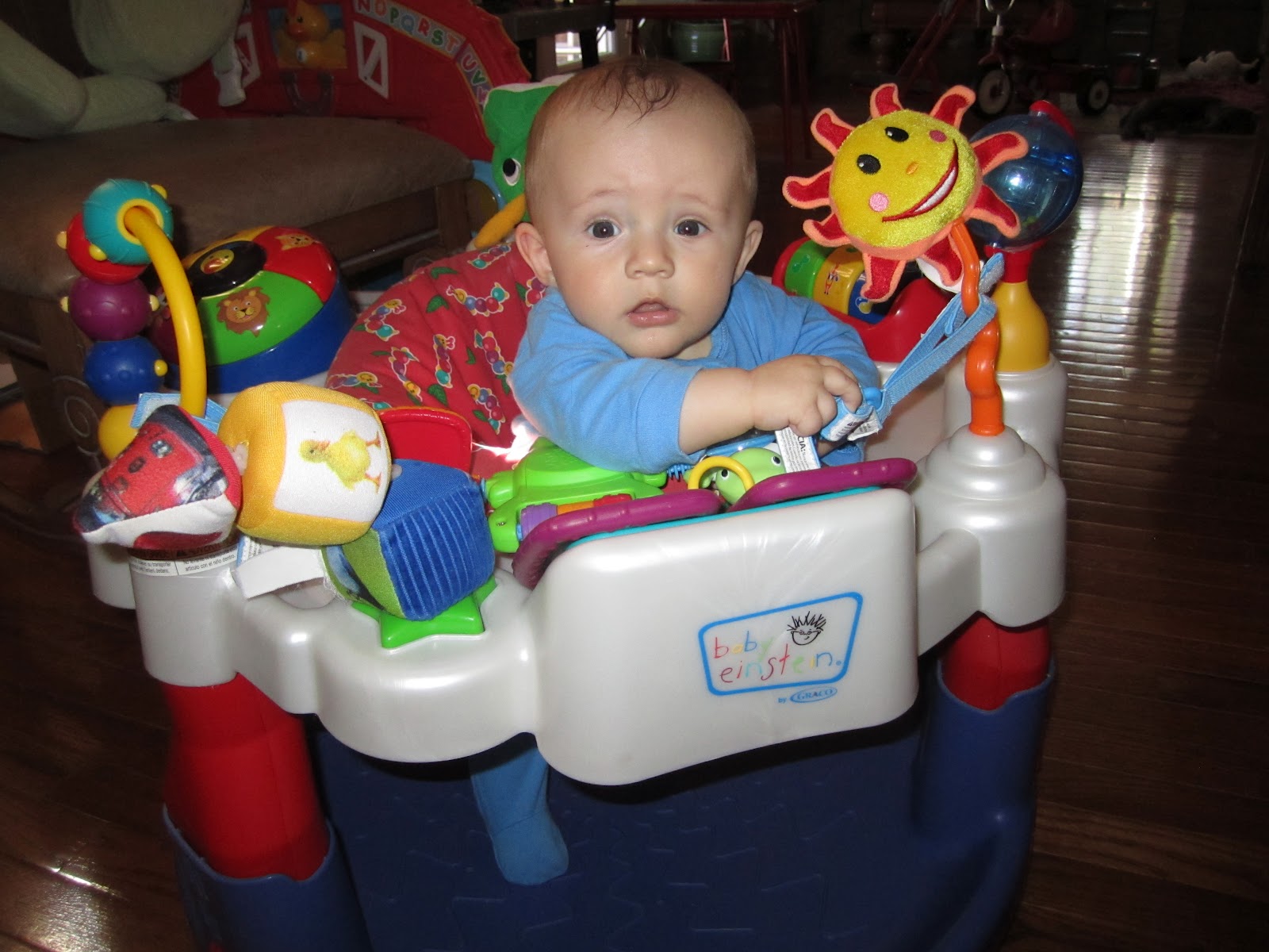 The boys have started to interact more regularly, including our baby being in the “Baby Einstein” contraption which allows him to sit upright and get a better view of the world around him. He talks up a storm – especially around 6:30 AM and at various other times during the day. He loves to cuddle and only complains when he can’t see what is going on or isn’t included. At our last visit to the pediatrician he scored the highest in the area of communication. Our entire family loves to interact and “talk” with him. He even likes to sit in mommy’s lap while she checks e-mail or blogs – as long as he is a part of the action he is happy. He enjoys rice cereal, oatmeal, sweet potatoes, and bananas. He has tried green beans but doesn’t appear to be thrilled about them. He still will not take a bottle or pacifier – he likes to suck his thumb. We absolutely adore our newest little family addition.