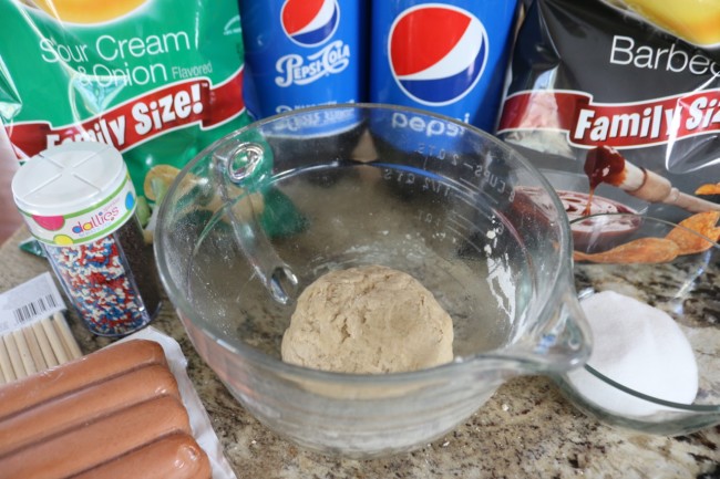 To create these Spiral Pretzel Hot Dogs you’ll need a few simple ingredients. This recipe makes enough for six spiral hot dogs. To make more, just double the recipe. You will not need to double the baking soda and water though since it’s just just for coating the pretzel hot dogs.