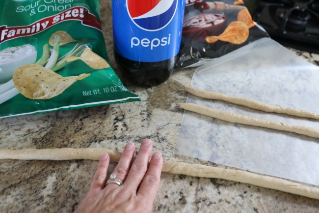 - Roll the Dough – This recipe makes 6 hot dog pretzel rolls. Divide the dough into six even chunks. Use two hands to roll the dough into long ropes about the diameter of your index finger. You’ll want each rope to be about 22 inches long. You can trim off any excess, or roll the dough thinner if you need a longer pretzel rope.