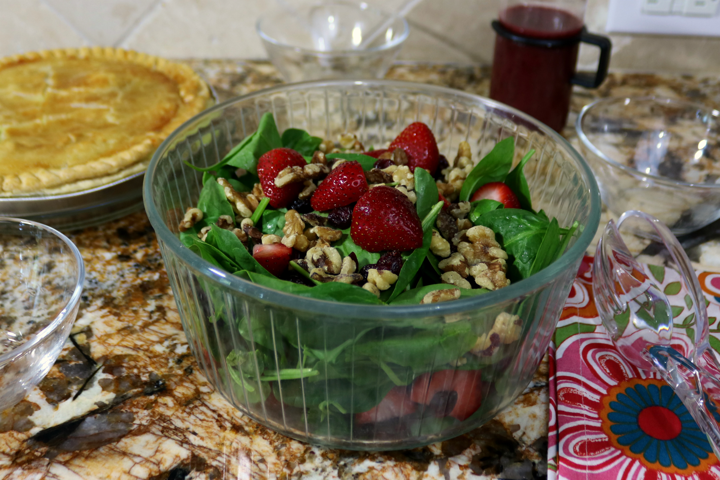 Our family loves to pair our Family Sized Chicken Pot Pie meal with a fresh, crunchy and sweet salad. One of our favorites is my Strawberry and Walnut Spinach Salad. It also includes dried cranberries and a light raspberry vinaigrette dressing.