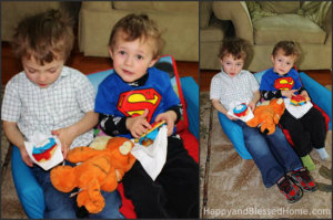 Boys with their Superhero Breakfast Pepperidge Farm Sweet Rolls from HappyandBlessedHome.com