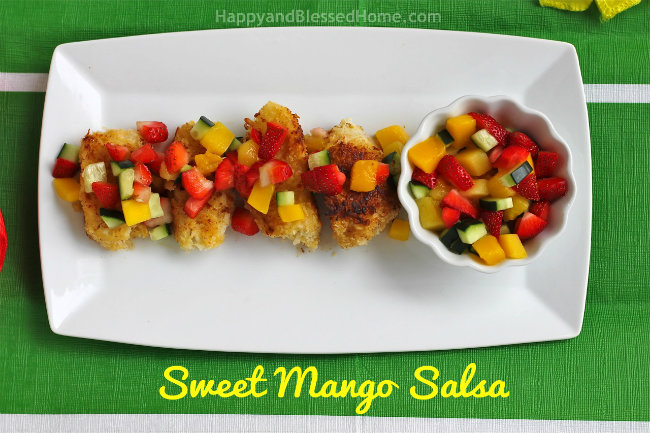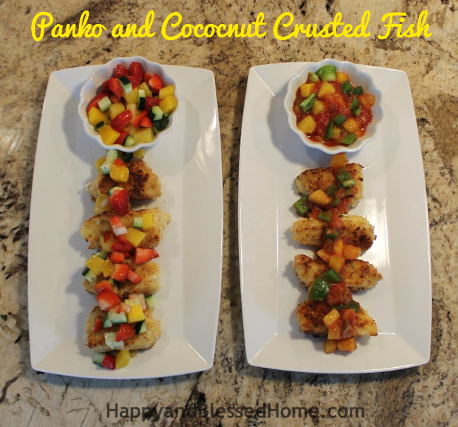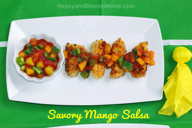 My husband absolutely loves this dish and I plan to make it a regular meal in our home. It makes a great party appetizer or main course for dinner. I hope these recipe ideas inspire HappyandBlessedHome.com readers. The crisp buttery flavor of the fried coconut and panko pairs wonderfully with the sweet and savory flavors of the mango salsas.