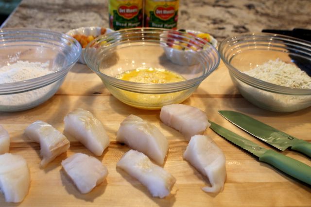 Now, I recommend cod for this particular recipe because cod holds together even when its handled repeatedly. To batter this fish, you’ll need to roll it, fry it, potentially keep it warm before guests arrive, and then plate it. Not all fish varieties can stand up to this type of movement, so for this dish, I recommend cod. Plus, it tastes delicious with the mango and sweet and savory flavors.