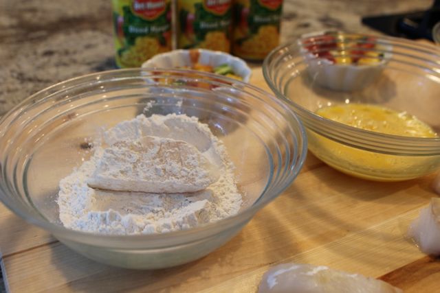 7. Step 7 – Roll fish in the flour first (bowl 1). Handle this fish carefully. It’s heartier than some other fish varieties, but you will still need to be careful during handling.