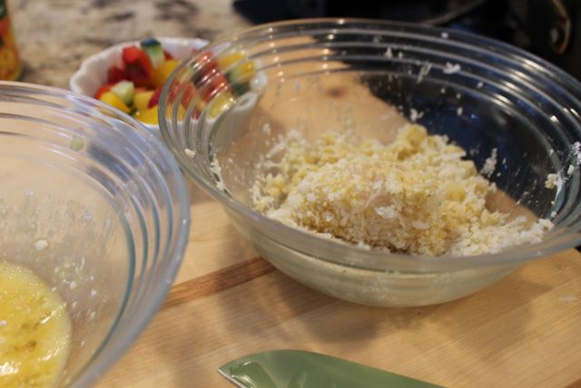 8. Step 8 – Roll the fish in the egg (bowl 2). 9. Step 9 – Roll the fish in the coconut and panko mixture (bowl 3) and coat it completely.