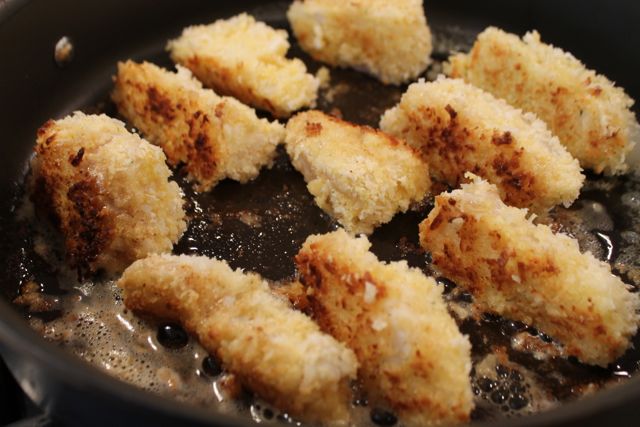 As the fish cooks if you notice that all your butter has been soaked up by the fish, just add more butter. You want an even coat of butter and browned panko and coconut on every side.