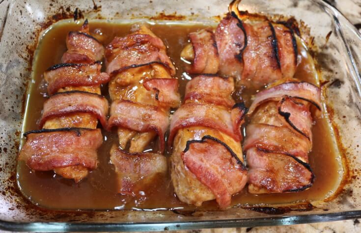 - Step 4 – Season. Wrap up to two slices of bacon around each chicken breast half. Sprinkle wrapped chicken breasts with garlic salt. By slathering on the BBQ sauce and wrapping it in bacon you are creating a seal around the chicken that will ensure it doesn’t dry out. Just to be sure you get extra tender, juicy chicken, wrap a piece of aluminum foil over the top of the baking dish before you put it in the oven.