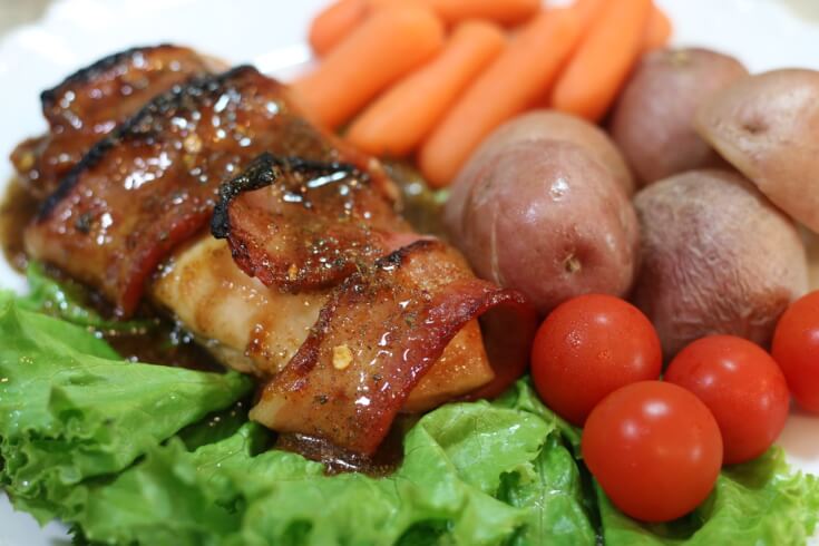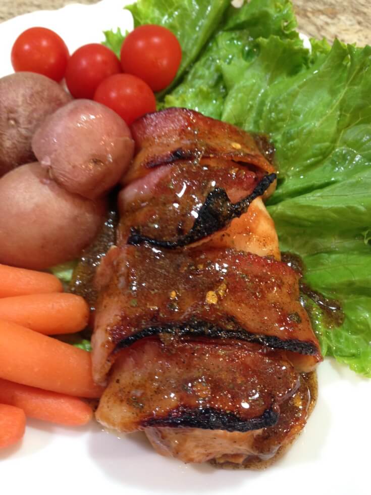 - Step 7 – Assemble. Remove the bacon-wrapped chicken from the oven and plate atop spinach leaves and rice. Or pair with vegetables of your choice.