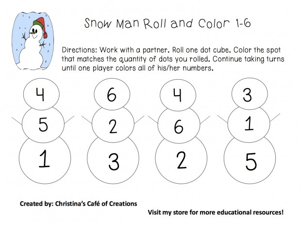 6. Enjoy this FREE Printable from Christina’s Café of Creations. I just thought this roll-the-dice and color the snowman printable was too cute. I contacted Christina and she agreed to allow me to host it here on my site as a free printable. Christina’s link will take you to her online “Teachers pay Teachers” store where you can find all sorts of other printables for purchase. Just click the image and you can print this at home.